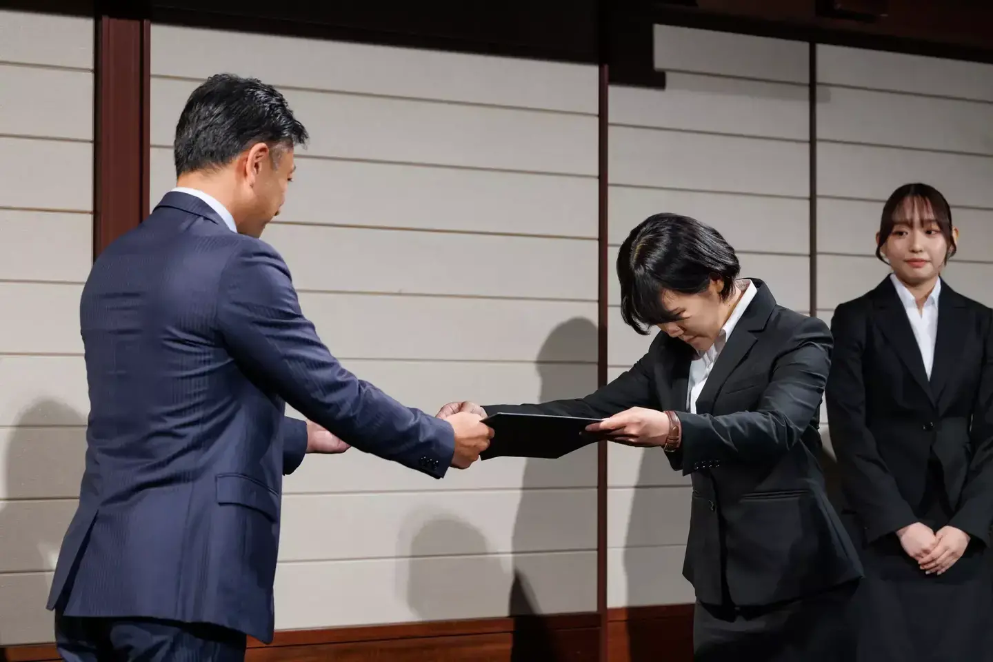 代表取締役社長の福重から内定証書が授与され、内定者は緊張を感じながらもその重みを感じるように力強く受け取っていました。